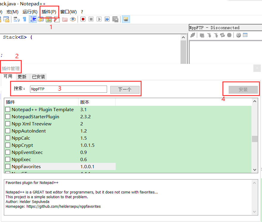 选择”插件“,在弹出的插件管理窗口中搜索”NppFTP“,点击”安装“,即可实现插件安装,若没有搜索到,可在”已安装“查看是否已经安装过;