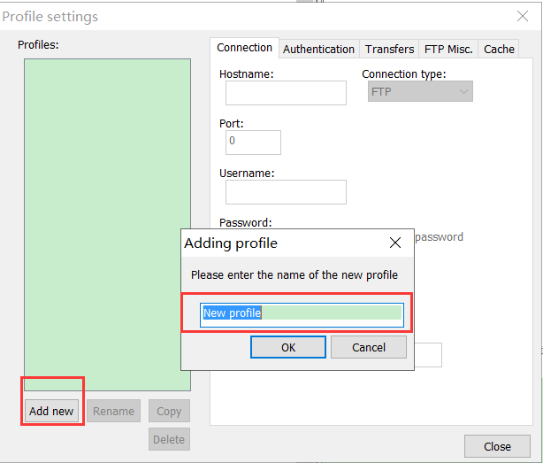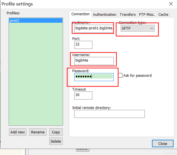 如下图所示,输入Hostname(/ip地址),选择“SFTP”,输入“Username”,“Password”,点击“close”;