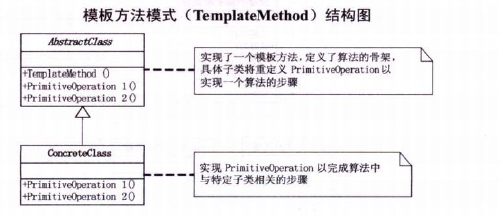 定义了一个操作中的算法的骨架,而将一些步骤延迟到子类中。模板方法使得子类可以不改变一个算法的结构即可重定义该算法的某些特定步骤。