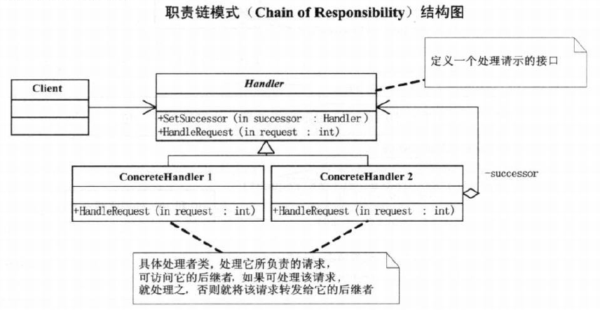 职责链模式:使多个对象都有机会处理请求,从而避免请求的发送者和接受者之间的耦合关系,将这个对象连成一条链,并沿着这条链传递下去,直到有一个对象处理它为止