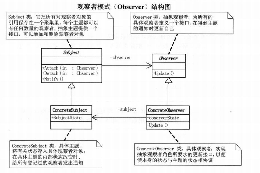 观察者模式又叫发布-订阅模式:定义了一种一对多的依赖关系,让多个观察者对象同时监听某一主题对象。这个主题对象在状态发生变化时,会通知所有观察者对象,使它们能够自动更新自己。